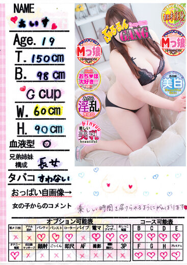 ★☆完全業界未経験★☆まだ誰にも染まっていない19歳の美少女『あいすちゃん』が当店で待望のデビューを果たしてくれました!!!小動物の顔立ちでクリっとした瞳に少し照れたような笑顔。こぼれそうなハリのあるGカップは高級メロンのように甘く吸いごたえ、揉みごたえは間違いありません!プレイに関してもそんなことまでしちゃうの!?と思わずこちらが驚いてしまうような、あんな事やこんなことまで照れながら素直に応えてくれる可愛さをお持ちの様です!ちょっぴりM気質な一面もあるようで意地悪にからかわれると顔を赤くしながらも嬉しそうにする姿はもっと可愛がりたくなります!まだまだ知らないことだらけの彼女ですが性欲値は測定できない程の強性欲だとのことです…どこまで甘くなってしまうかはお会いした方だけの秘密です!是非、彼女と素敵な出逢いをしてみませんか?ご予約必須な存在です!【デリバリー】○【自宅】×【アレルギー】なし