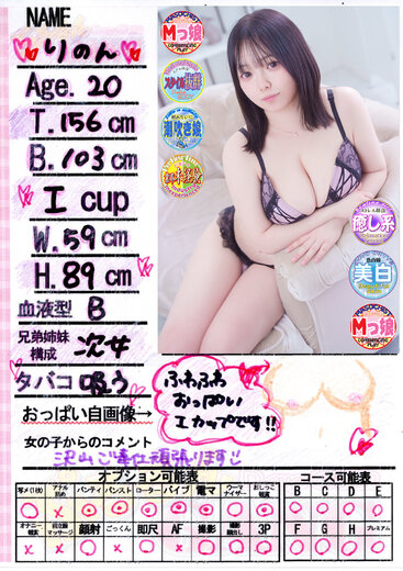 黒髪ロリ系性欲盛んなドM「りのん」ちゃんデビューです!まず目を引くのが、綺麗に手入れされた黒髪。つややかで健康的な髪が、まるで少女のような雰囲気を引き立てています。ロリ系の可愛らしさと、思わず抱きしめたくなる雰囲気は多くの方に刺さるはず。さらに、もちもちの美肌はピチピチで触れるたびに感動間違いなし!若さ溢れるその肌に、思わず時間を忘れてしまうお客様も続出です。そして彼女の最大の特徴は…常にずぶ濡れ!期待を裏切らない潤いっぷりで、プレイ中はもうビチョビチョ。特にキスすると、彼女もたまらずさらに濡れてしまい、興奮は最高潮に。イキやすい体質なので、こちらの手や唇がちょっと触れるだけで、可愛い声が止まらなくなります。「こんな娘が本当にいるの?」と疑いたくなるほどの逸材。初々しさと大胆さが絶妙にミックスされた時間は、まさに夢のようなひととき。りのんちゃんの”ずぶ濡れ体験”、ぜひ一度味わってみてください。リピート必至、最高の快感をご堪能あれ!